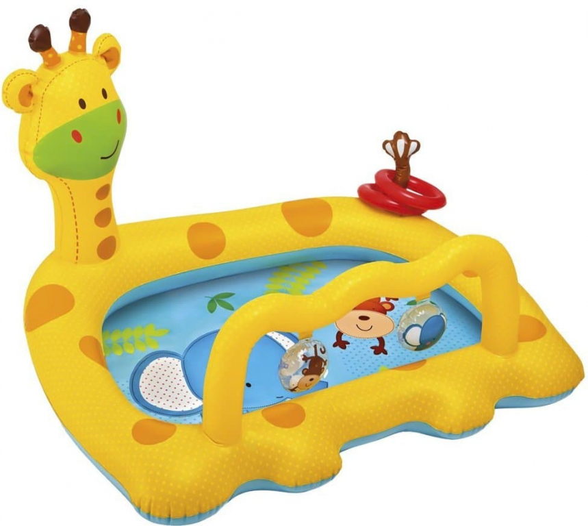 Он очень удобен для детей самого младшего возраста - невысокий, мягкий и комфортный. Дети чувствуют себя в этом бассейне, как в сказке. Жирафа легко перенести и надуть. В комплекте 2 надувных кольца.